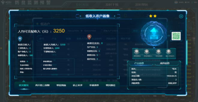 构建防返贫监测一张图,通过天地图形式,对帮扶情况基本信息、致贫原因、两不愁三保障、收支情况、帮扶措施、帮扶记录等信息进行可视化分析。并利用低收入农户画像管理技术,赋予农户每人“一码”,以三色码原则分别对应不同状态的低收入人群。