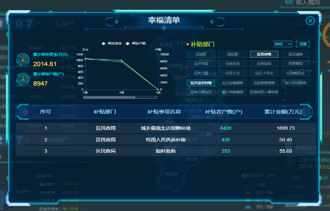 根据不同预警事件设立监测边界、规则、算法,打通医保、残联、教育等主要部门数据,运用各项数据分析低收入农户群体,对大病支出、教育支出、受灾等发起预警,及时提醒扶贫干部走访;打通掌上应用走访数据,实现实时跟踪帮扶情况。 ·防返贫一件事当低收入农户的诉求发生后,针对诉求的处理实现从受理、流转、完结等流程闭环的监管,并根据不同环节的时间设定进行预警。