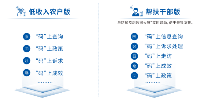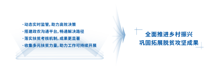通过大数据中心的调研与采集,将扶贫相关数据归集至公共数据平台。再结合管理系统建设帮扶干部数据库、幸福清单数据库、一户一策数据库、农户画像数据库等相关库,综合构建扶贫数据标准与共享标准,打通数据壁垒,优化业务流程、提升决策效率。