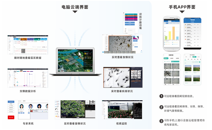 系统利用智能化监测设备、轨迹分析模型与数字化预测技术,可满足各级用户网页、手机查询田间虫情、苗情、灾情、环境数据。同时联合作物管理知识、作物图库、灾害指标等模块,对作物实施远程监测与诊断,提供智能化、自动化管理决策。